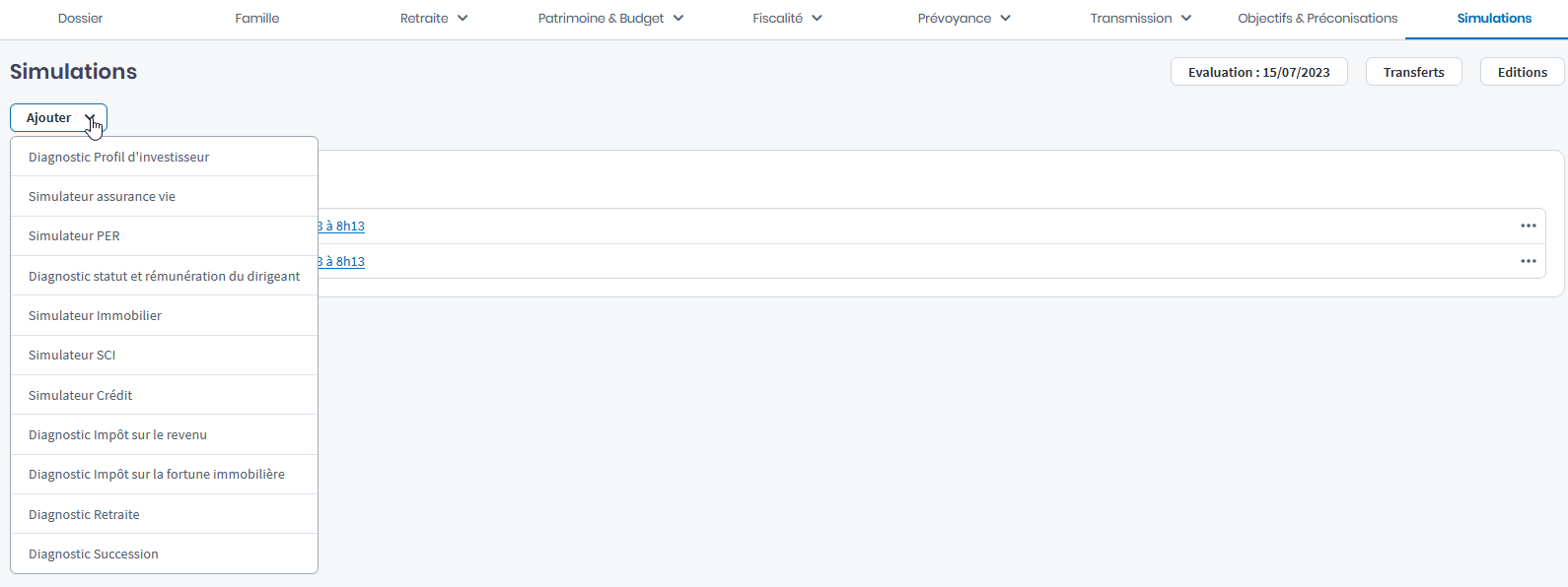 Dans le menu Simulations, réalisez vos simulations avec les données issues du dossier Big comme la situation familiale, le nombre de personnes à charge ou l’ensemble des revenus du client de l’année d’évaluation du dossier, et le patrimoine.