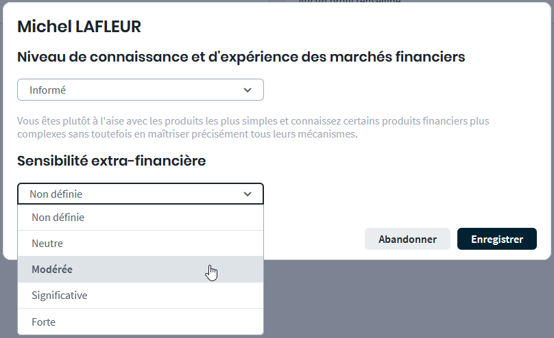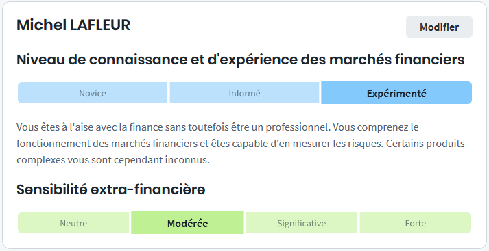 Note : pour que la fonction « Profil d’investisseur » soit présente dans les dossiers de vos clients, elle doit être activée dans le module d’administration. Contactez votre administrateur si besoin.