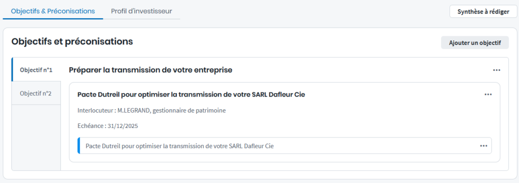 La rubrique Objectifs & Préconisations vous donne la possibilité de dresser la liste des objectifs et des préconisations que vous réalisez auprès de votre client. Une préconisation se décompose en une préconisation théorique à laquelle est associé une ou plusieurs solutions.