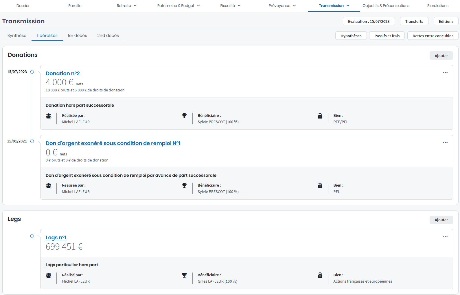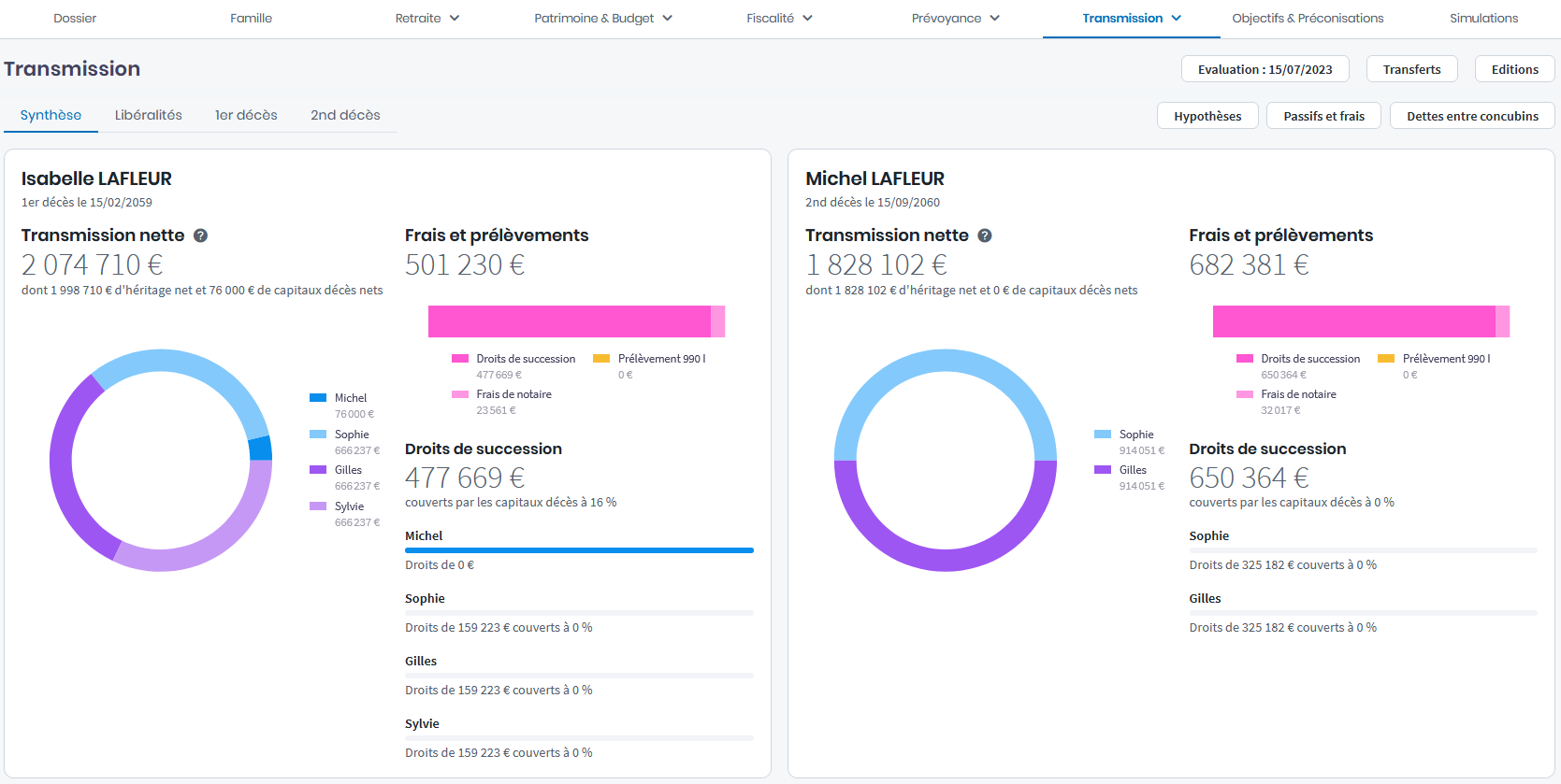 Le module Transmission présente l’impact des décès en matière de partage successoral.