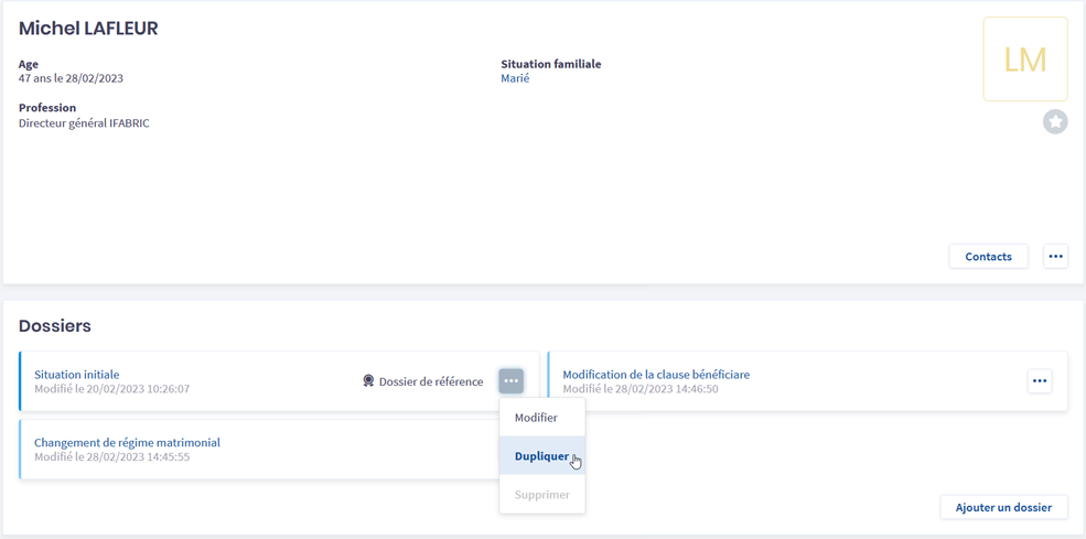 Si vos préconisations touchent à la fois les dimensions fiscales, patrimoniales et/ou successorales de votre client, la solution est de dupliquer votre dossier client, Cliquez sur ce lien pour savoir comment mettre en œuvre cette fonctionnalité essentielle !