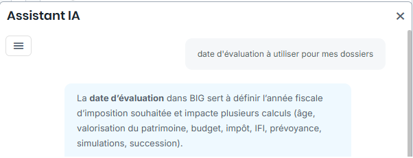Interrogez l’Assistant IA de Big : « date d’évaluation à utiliser pour mes dossiers« , appuyez sur Entrée et laissez-vous guider !