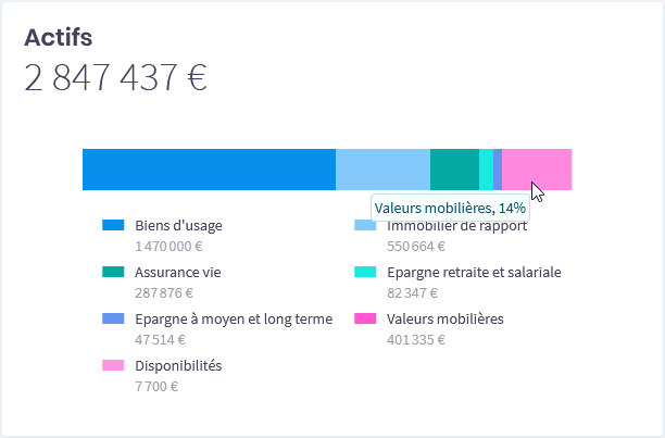 Big comporte de nombreux graphiques ; la valeur absolue (montant) des différents indicateurs est généralement affichée dans la légende sous le graphique ; sachez que vous pouvez connaitre la valeur en contexte de ces indicateurs en positionnant le curseur de la souris sur un élément du graphique (ou en le touchant, si vous utilisez une tablette). La valeur qui s’affiche peut alors être exprimée en absolu (montant) ou en relatif (pourcentage).