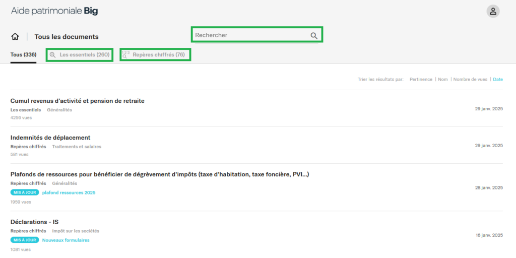 En cliquant sur Aides > Aide patrimoniale en haut à droite de la fenêtre de Big, accédez à de nombreux articles sur tous les domaines de la règlementation fiscale, juridique et sociale traités par Big :